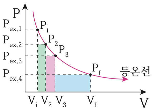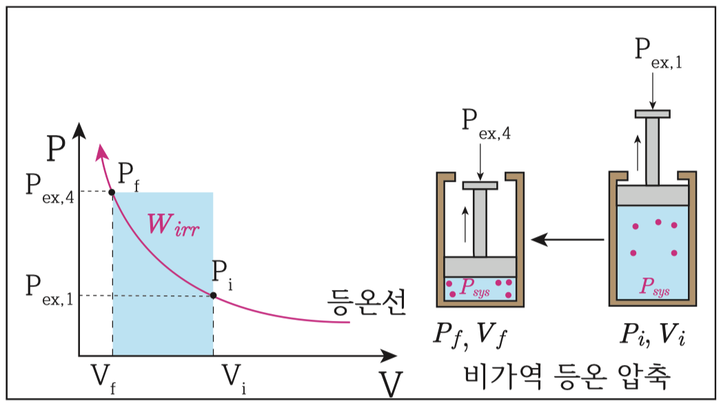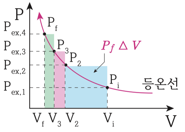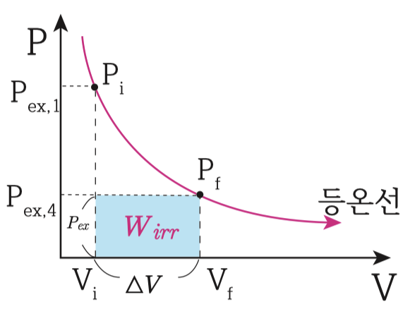 외부압력은 Pex4로 일정하게 유지되고, 부피변화는 Vf-Vi, 압축일은 Pex4*(Vf-Vi)가 되므로, PV선도에서는 파란색 사각형 면적이 됩니다.