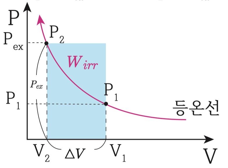 외부압력 Pex에 대항해서 V2, P2까지 비가역 등온팽창할 때의 일의 크기를 봅시다.