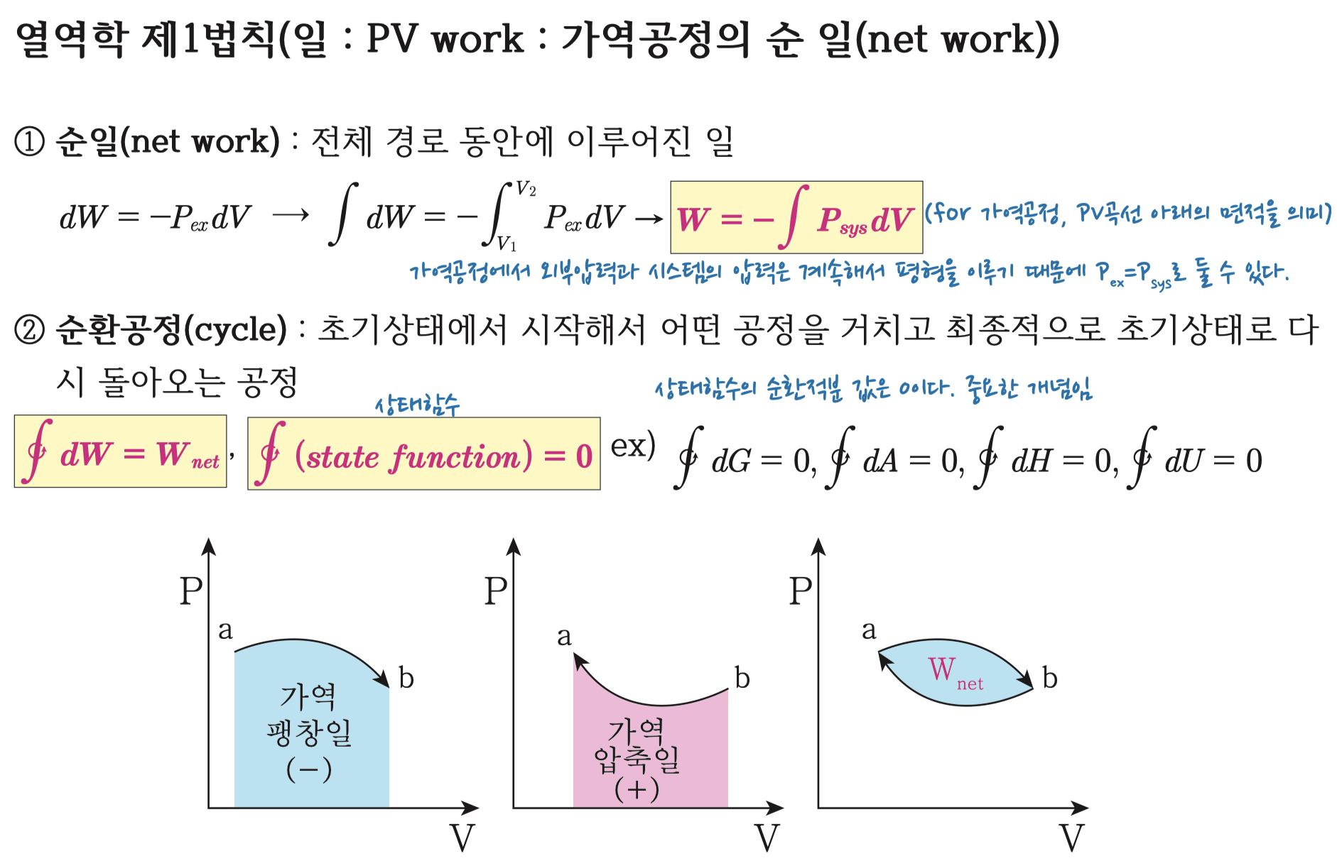 정리하면, PV선도에서 어떠한 경로에 대한 적분면적은 일의 크기 를 의미하고, 전체 경로에 대해서 적분한 면적이 순일이라는 의미 입니다.