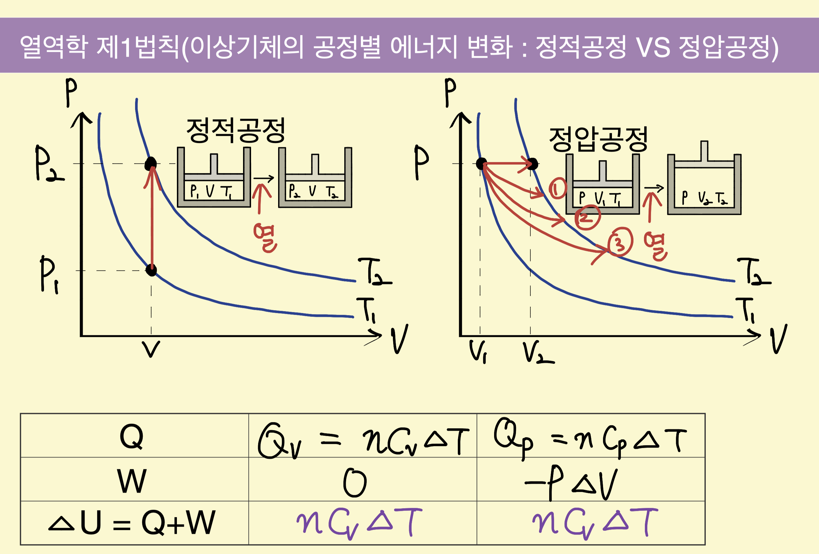 < 열역학 제1법칙 : 이상기체의 공정별 에너지 변화 : 가역 정적공정, 가역 정압공정 >