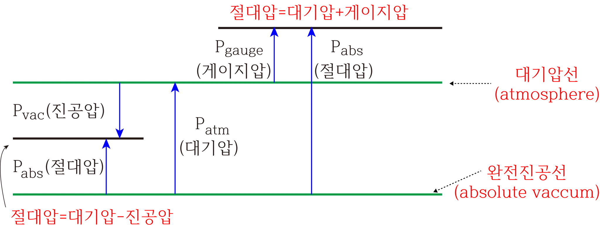 - 대기압선보다 더 높은 압력을 게이지압이라고 하고, 대기압선보다 더 낮은 압력을 진공압력이라 한다.